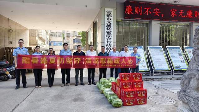 7月30日上午,盐田港港航发展(常德)有限公司来到常德市交通运输综合行政执法支队,将西瓜、凉茶等物资送到执法人员手中,对奋战在高温酷暑下的执法人员表示最诚挚的慰问。