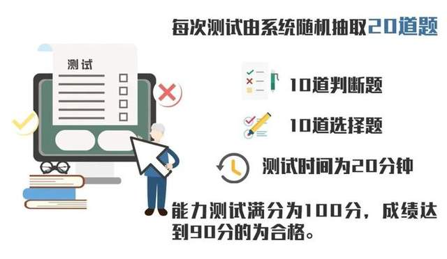 每次测试由系统随机抽取10道单选题和10道判断题,测试时间为20分钟,成绩达到90分合格。“三力”测试一年内最多可以进行5次,五次均不合格的可在首次不合格之日起一年后重新参加测试。