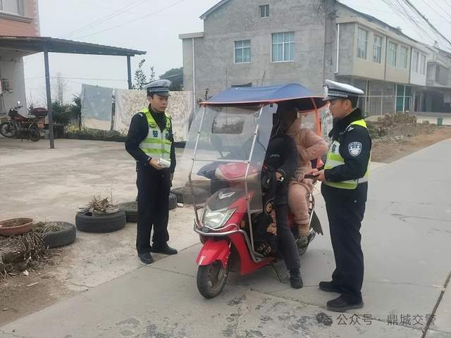 2月4日9时33分,鼎城交警大队六中队民警在X044韩公渡镇路段执勤时,发现一辆加装遮阳伞的电动自行车后座违法搭载了一名女子,且驾驶人与乘车人均未佩戴安全头盔。民警随即拦停该车。
