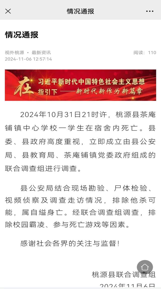 11月6日,指尖新闻记者从桃源县县委宣传部获悉,当日中午,桃源县联合调查组发布《情况通报》,称:“2024年10月31日21时许,桃源县茶庵铺镇中心学校一学生在宿舍内死亡。县委、县政府高度重视,立即成立由县公安局、县教育局、茶庵铺镇党委政府组成的联合调查组进行调查。县公安局结合现场勘验、尸体检验、视频侦察及调查走访情况,排除他杀可能,属自缢身亡。经联合调查组调查,排除校园霸凌、参与死亡游戏等因素。”