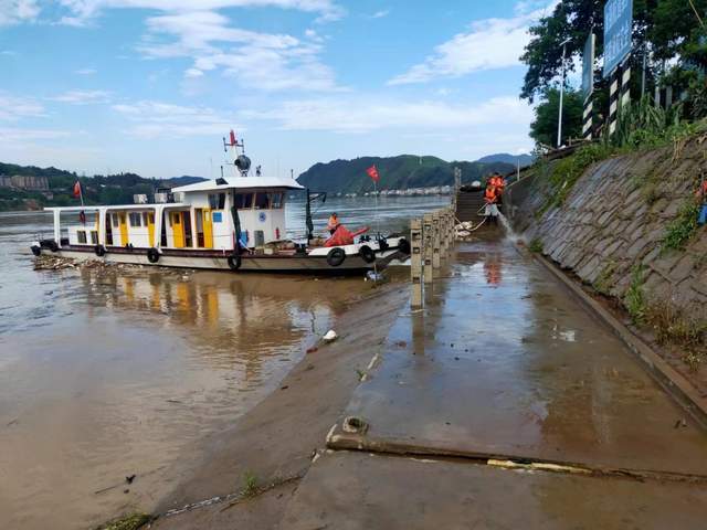 五强溪航道处工作人员清洗工作码头淤泥