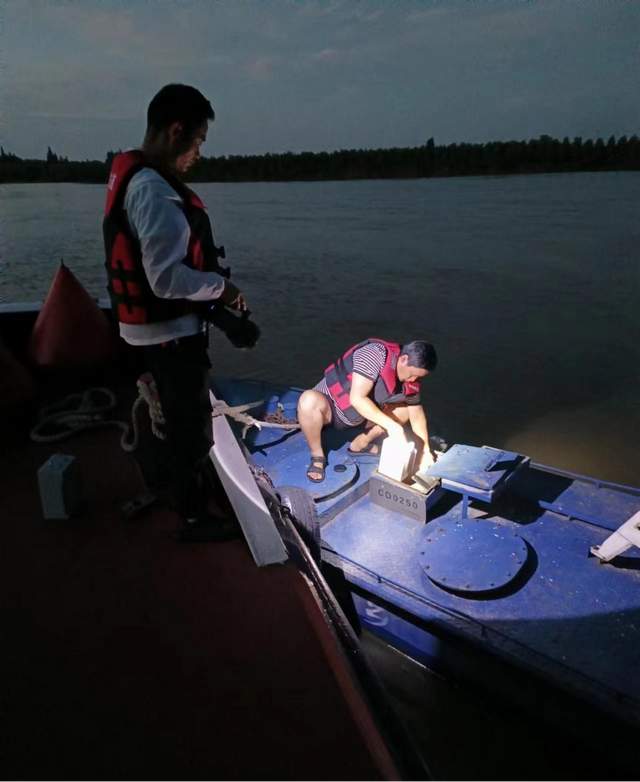 武圣宫航道处工作人员在夜幕中清理漂浮物