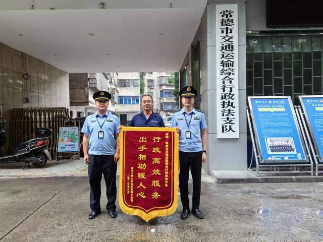 6月1日,武汉力神大件物流有限公司驾驶员将印有“行政高效服务 出手相助暖人心”字样的锦旗送到常德市交通运输综合行政执法支队,感谢执法人员高效服务,及时解决企业难题。