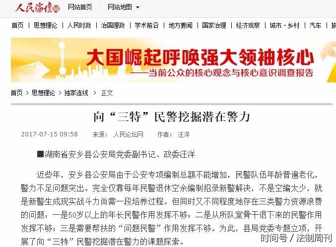 7月15日,人民论坛网全文刊发了安乡公安局党委副书记、政委汪洋的一篇多举措在“三特”民警问题上动脑筋,多举措解决警力资源不足的课题探索。
