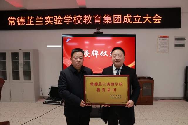 朱方武(左)为 “常德芷兰实验学校教育集团”授牌,周相兵(右)代表集团接牌
