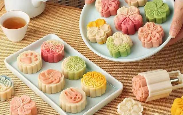 每个月饼大概取冰皮30克,馅20克,把馅揉成鸽子蛋大小,包在搓好的冰皮里,用模轻轻一压,一个玲珑精致的冰皮月饼就大告功成了。