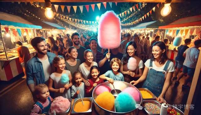 神奇的事发生了,被烘热的糖变成一层层薄纱似的从机器里飞出来,小贩取出一枝细木条,将它们一层层包裹起来,成了一个大球似的、雪白的、蓬松的、飘着香气的棉花糖。