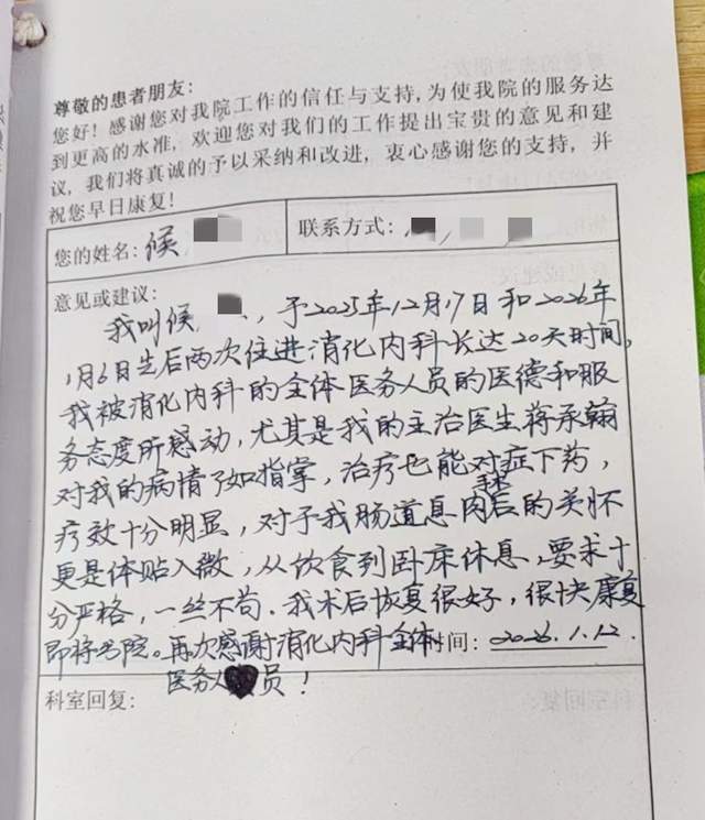 患者熊阿姨康复出院时,特意在留言本上写道:“感谢汪医生和全体医护人员,你们技术高,态度好,让我顺利度过了难关!”“蒋医生对我的病情了如指掌,对症下药、疗效明显,手术后的关怀更是体贴入微。”候阿姨在出院时表达了真挚的感谢。接受结肠息肉手术的罗阿姨,则对管床的刘医生赞不绝口:“刘医生每天来都笑眯眯的,什么事都讲得明明白白,帮我精打细算,就像自家孩子一样贴心。”这些朴素的言语,是肯定,是信任,更是激励。它们汇聚成一股暖流,流淌在医患之间,也让医护人员更加坚定了“以患者为中心”的服务信念。
