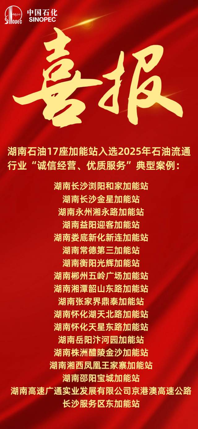 近日,由中国石油流通协会主办的2025年“诚信经营、优质服务”典型案例推荐宣传活动成果发布会在北京举行。湖南省35座入选,其中湖南石油17座加能站凭借卓越的诚信经营表现和优质的客户服务成功入选典型案例榜单,常德第三加能站位列其中,成为全省14个市州入选站点中的一员。 这些站点涵盖了高速服务区、城区中心、县域重镇等关键节点,展现了中国石化湖南石油分公司在诚信经营与优质服务方面的扎实成效。