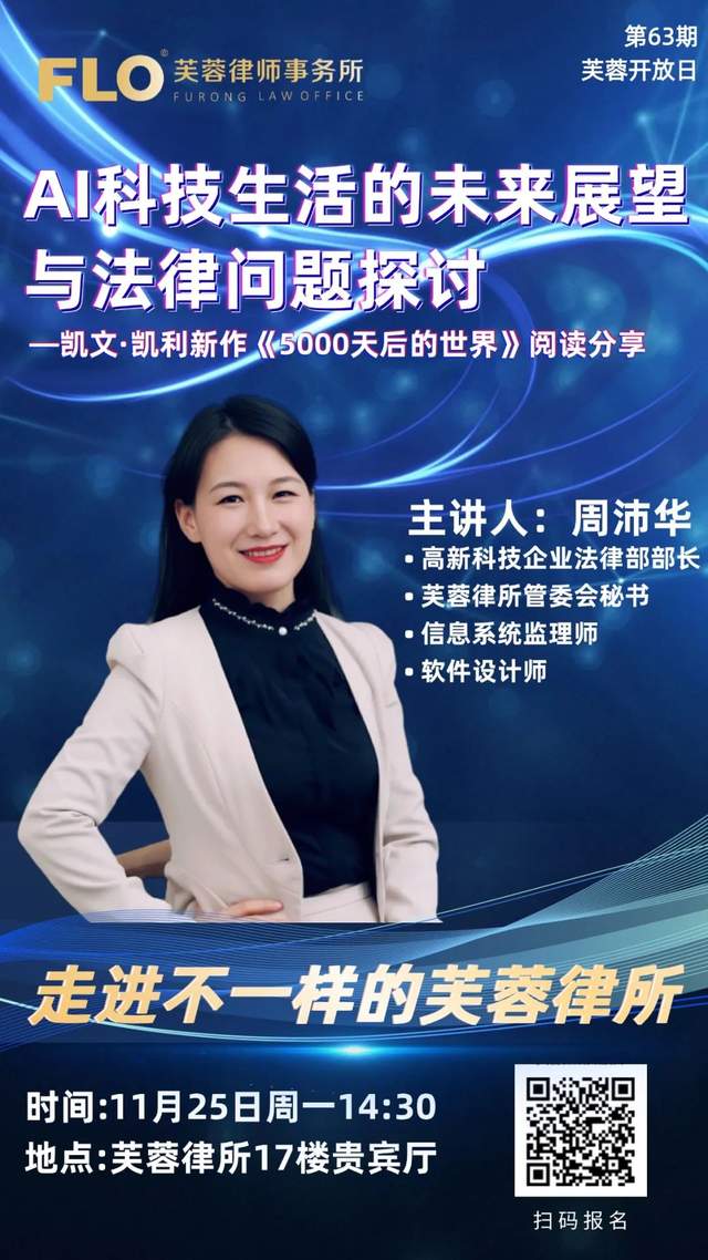 11月25日,湖南芙蓉律师事务所将举办第63期开放日,特邀芙蓉律所高新科技企业法律部部长、管委会秘书周沛华律师与您共同探索 AI 科技生活的无限可能,同时直面 AI 发展带来的法律挑战。