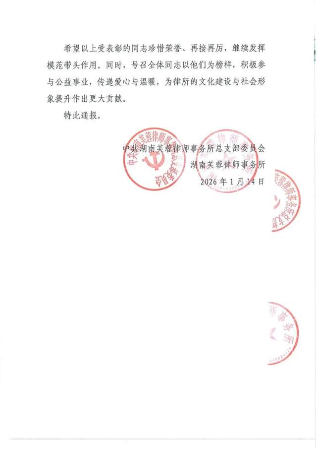 为表彰先进、树立典型,经党总支及律所研究决定,湖南芙蓉律师事务所特对在本次活动中表现突出的先进个人及团队予以通报表扬。