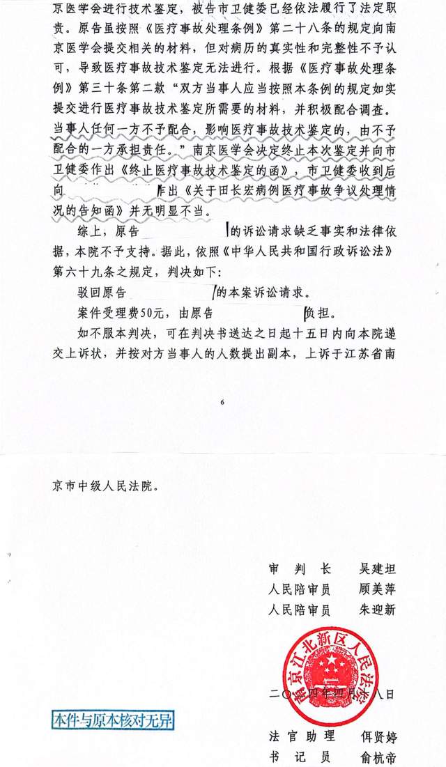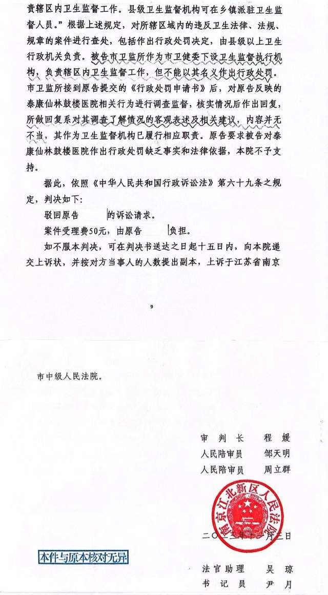 但是家属起诉卫生监督所一案,南京江北新区法院和南京中级法院均认为:卫生监督的回复并无不当。但对医院篡改病历的行为是否违法,法院却只字不提,并判患方败诉。