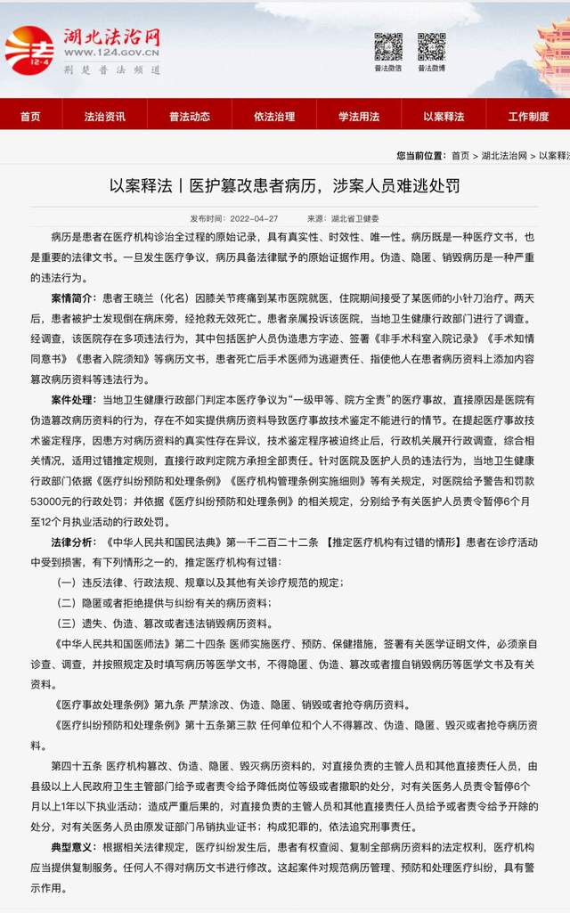 患者家属在《湖北法治网》上搜索到同样一个事件,其处理办法及结果却完全不一样。