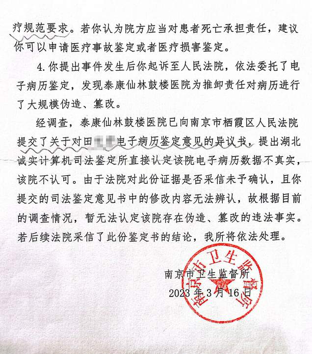 患者田××在南京泰康仙林鼓楼医院就医时不明死亡,医院为了免责不顾医德、良心,违法违规大规模修改了病历,而南京相关卫生行政主管部门和医疗鉴定机构却违背事实胡说:因患方对病历真实性、完整性置疑,就拒绝处理医疗事故、拒绝认定篡改病历的行为违法。