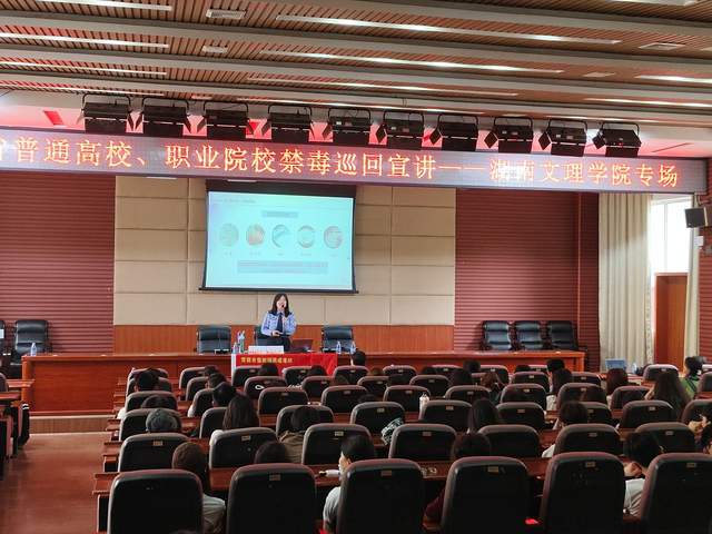 为进一步做好毒品预防教育工作,提升青年大学生识毒防毒拒毒意识和能力,营造健康成长良好环境,推动创建平安和谐校园,5月7日,湖南省普通高校、职业院校禁毒巡回宣讲活动在湖南文理学院船型楼报告厅举办。本次宣讲活动由常德市禁毒办、常德市强制隔离戒毒所、常德市教育局、共青团常德市委、常德市禁毒协会等多家单位联合主办,常德市强制隔离戒毒所“啄木鸟”禁毒宣讲团成员廖欣杏主讲,250余名师生现场聆听报告。