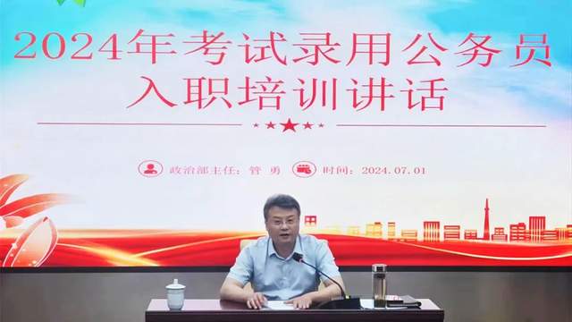 会上,管勇提出四点要求,一是做一名政治合格的公务员。要有崇高的理想信念,坚定中国特色社会主义道路自信、理论自信、制度自信、文化自信。要始终对党绝对忠诚,该做的要尽力做好,该担当的要敢于担当,不该做的坚决不做,不该说的坚决不说。要注重提高政治理论水平,不断提高运用党的创新理论指导实践、推动工作的能力。二是做一名业务精湛的公务员。要善于学习,精学专业理论,深学业务知识,努力成为精通业务的“政策通”、熟悉情况的“活字典”。要勤于思考,加强后天锻炼,勤学习、勤积累、勤记忆、勤模拟、勤准备。要乐于动笔,长期学习、磨砺和积累,提高文字综合能力。三是做一名作风过硬的公务员。要始终勤勉尽责,以满腔热忱的感情对待事业,以高度负责的精神对待工作。要敢于担当任事,迎难而上承担重要工作,独当一面提出合理化建议。要践行为民宗旨,坚持以人民为中心,重视调查研究,彰显为民情怀。四是做一名廉洁高尚的公务员。要始终廉洁自律,守住清贫、敬畏法纪、敬畏权力、敬畏组织,实实在在做人,稳稳当当做事。要保持健康心态,积极面对挫折,正确对待得失,理性看待职务升迁,以正确世界观、人生观、价值观指导自己的选择。要涵养高尚品德,正确处理人际关系,把握工作与家庭的平衡,做社会公德、职业道德、家庭美德、个人品德的模范。