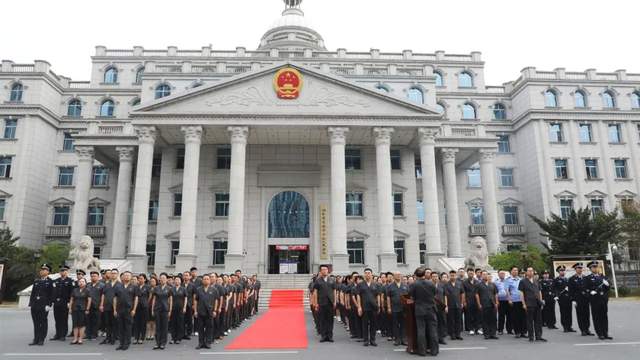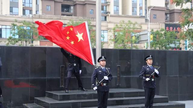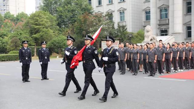 上午8时15分,升旗仪式开始。干警们在前坪整装列队,仪仗队迈着整齐划一的步伐护送国旗入场。伴随着雄壮的国歌声,升旗手奋力挥臂将国旗抛向空中,鲜艳的五星红旗冉冉升起。全体干警肃穆而立,满怀崇敬之情,庄严地向国旗行注目礼,向国旗、向伟大祖国致以崇高的敬意。