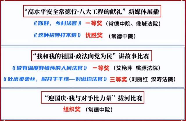 在“我和我的祖国·政法向党为民”讲故事比赛中,桃源县人民法院艾艳萍讲述故事《做有温度有情怀的人民法官》,荣获一等奖;汉寿县人民法院刘丽红讲述故事《吐出柔柔丝,解开千千结——刘淑珍法官》,荣获三等奖。在“高水平安全常德行·八大工程的献礼”新媒体展播中,常德市中级人民法院和鼎城区人民法院制作的视频《你好,乡村法官》,荣获一等奖;常德市中级人民法院制作的视频《这种招呼打不得——三个规定》,荣获优胜奖。在“迎国庆·我与对手比力量”拔河比赛中,常德市中级人民法院荣获组织奖。