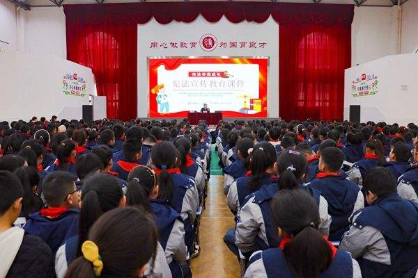 “你知道宪法的成长历程吗?”“你知道宪法是如何影响我们的生活吗?”活动现场,干警用通俗易懂的语言,结合PPT生动展示,讲解了宪法的基本内容、宪法的发展历程、宪法和我们之间的关系等宪法知识,并引导同学们尊崇宪法、学习宪法、维护宪法,争当维护宪法权威的小卫士和遵纪守法的好少年。在互动问答环节,同学们争先恐后举手抢答,现场氛围热烈浓厚,寓教于乐的同时也加深了同学们对宪法知识的理解和记忆。法院干警还为同学们发放《未成年人保护》普法宣传手册。
