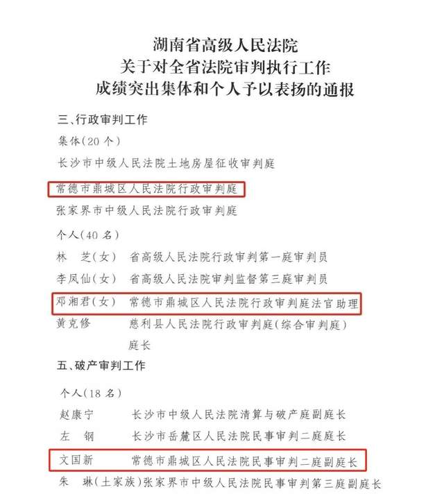 近日,湖南省高级人民法院印发《关于对全省法院审判执行工作成绩突出集体和个人予以表扬的通报》《关于对全省法院行政、综合工作成绩突出集体和个人予以表扬的通报》《关于对全省法院“枫桥式人民法庭”、人民法庭工作成绩突出集体和个人予以表扬的通报》,常德市鼎城区人民法院获多项省级表彰。
