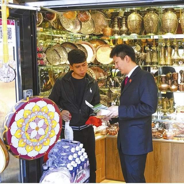 五月二十一日,新疆维吾尔自治区乌鲁木齐市天山区人民法院干警来到『国际大巴扎』景区,为景区经营者发放民法典宣传手册。(杨东 摄)