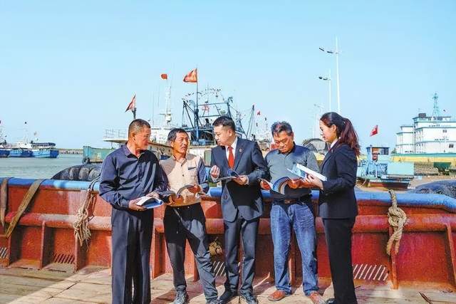 近日,江苏省射阳县人民法院黄沙港人民法庭干警走进国家中心渔港黄沙港,以民法典为主线,结合渔业法、乡村振兴促进法等法律法规,深入浅出地讲解非法捕捞、渔船租赁、劳务纠纷等与渔业、渔民息息相关的法律知识。(王晓婷 邓寒青 摄)