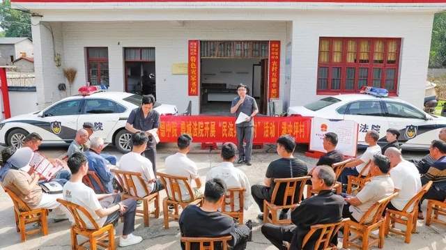 干警在港中坪村农村互助幸福屋前搭建起开放式法律知识课堂,向村民讲解民法典中的法律知识。