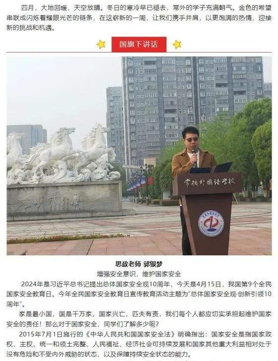 国家安全教育不是一时之事,需要建立长效机制,将国家安全教育融入日常教学和生活中。往后常德外国语学校将开设相关课程、举办定期讲座、开展主题实践活动,将国家安全教育常态化、制度化,确保师生能够长期受益。