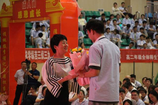 仪式现场,分管校长、行政、各班主任老师、科任老师为高三学子送上成人礼祝福;学生向老师行弟子礼并赠送鲜花。在家长的陪伴下,437名高三学子依次走过成人门、跃龙门,校领导为学生们赠送了成人礼物和成人徽章。