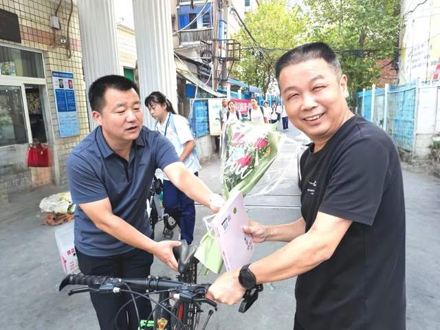 教师郑月明骑车刚进校门,副校长胡卫国就将鲜花和书籍递到她手中,“感谢感谢,收到礼物好开心!”教师苏太兵也收到了副校长黄少华送来的教师节礼物,激动地连声道谢。