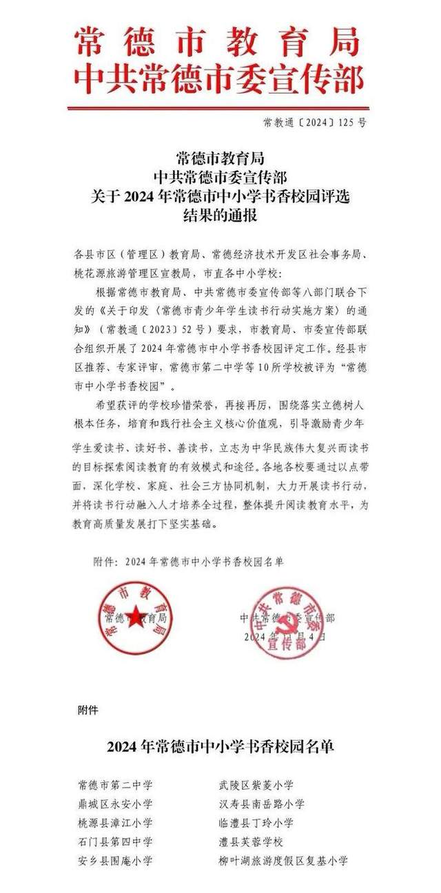 近日,由常德市教育局、市委宣传部联合组织开展的2024 年常德市中小学书香校园评定工作结束,经县市区推荐、专家评审,常德市第二中学等10所学校被评为“常德市中小学书香校园”。