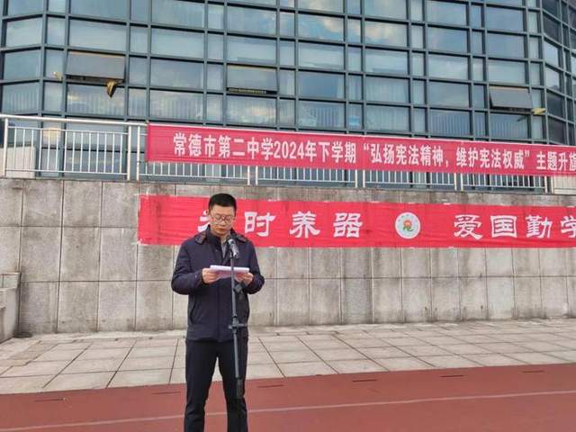 党委委员、专职纪检员肖清林以《尊宪崇法,担当民族复兴大任》为题作国旗下的讲话。他强调青少年是全面建设社会主义现代化国家的主力军、生力军。深入开展青少年宪法法治教育,是推动宪法实施成为全体人民自觉行动的重要途径,是培养担当民族复兴大任的时代新人的重要内容。全校师生要厚植爱国主义情怀,践行社会主义核心价值观,心存敬畏与法同行,让尊法、学法、守法、用法在学校蔚然成风。