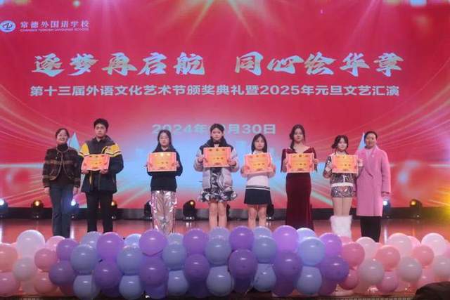 灵蛇献瑞迎新岁,彩凤鸣春耀中华。12月30日晚,常德外国语学校第十三届校园外语文化艺术节颁奖典礼暨2025年元旦晚会在才艺馆盛大举行。活动以“逐梦再启航,同心绘华章”为主题,17个精彩纷呈的师生节目与1个嘉宾特别演出,为全体观众带来了一场美妙的视听盛宴。常德市教育局副局长朱方武、市教育局二级调研员李呈喜、市教育局四级调研员熊延海、王林和市教育团工委书记龙家骅及家委会代表受邀出席了晚会。学校援藏教师丁惠芬、退休教师代表胡晓红及家长代表到场观礼。