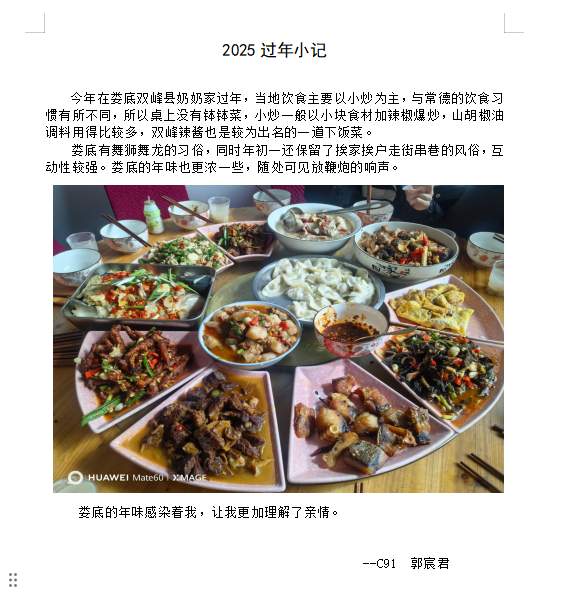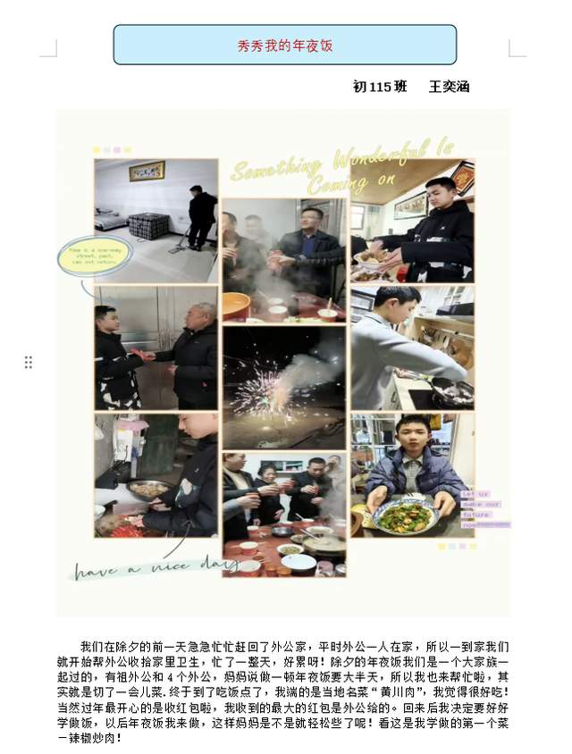 初91班郭宸君介绍了家乡娄底双峰县的特色菜肴;初099班李雨涵分享了写对联的成就感;初104班潘楷瑞感叹亲子阅读的重要性,认为它是一种生活方式;而粟杨同学则表示要“和家人一起在书海中探索、成长,共同创造美好回忆”。