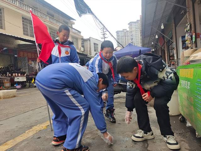 活动中,党支部成员带头示范,党员教师与少先队员组成志愿服务队,分赴社区各区域开展环境清扫、文明宣传等实践。2001至2009班师生按支部统一规划,对星欣园、农贸市场等点位进行深度清理。党员教师主动承担安全保障、组织协调等任务,确保活动有序开展。少先队员身着校服、佩戴红领巾,在党旗与队旗的辉映下,用行动诠释“奉献、友爱、互助、进步”的志愿精神,展现新时代青少年的责任担当。