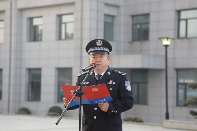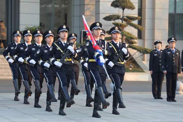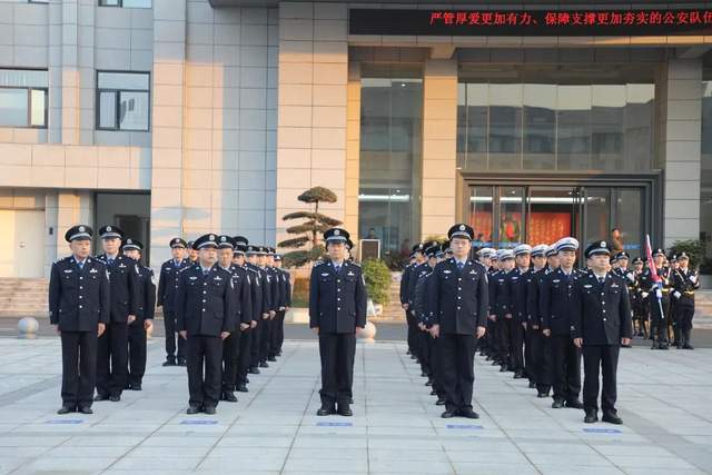 上午8时,全体民警身着警服整齐列队,伴随着初升的朝阳,护旗手护送警旗,步履铿锵。