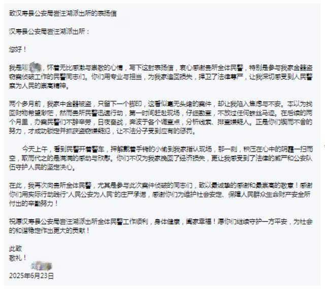 6月23日,当得知盗贼落网后,激动万分的邓女士便写下了这封饱含真挚谢意的感谢信。