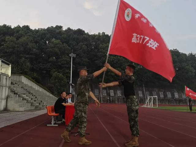 随后,政教科代科长伍智云宣读军训纪律要求、军训优秀班级和先进个人评选方案,要求参训学生积极配合教官的工作,服从调度、听从指挥,勇于克服困难、挑战自我;武警常德支队副中队长肖彬为各班教官授班旗。