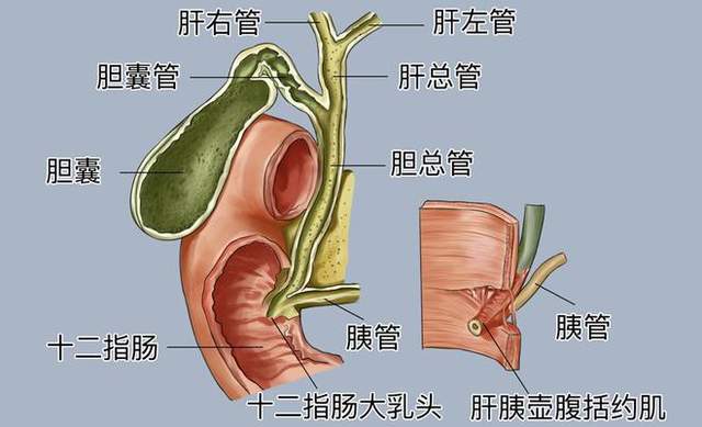 胆总管与胰管汇合形成略膨大的肝胰壶腹(壶腹),开口于十二指肠大乳头。在壶腹周围有环形平滑肌包绕,称壶腹括约肌,可以控制胆汁和胰液的排出。