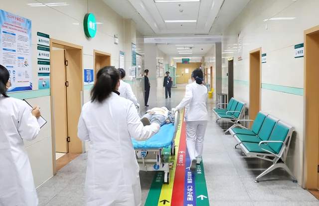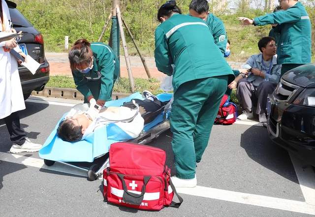 伴随着一阵急救电话铃响,演练正式开始。接线班立即派出3辆车前往现场急救。救护车到达现场后,急救医生立即对现场伤者进行检伤分类,分别用绿、黄、红三种颜色,对轻、重、危重伤病员作出标志。现场对伤者进行实时治疗后,迅速将全部伤者转移至车上送至医院,途中通知医务科邀请创伤MDT团队前往急诊科待命。