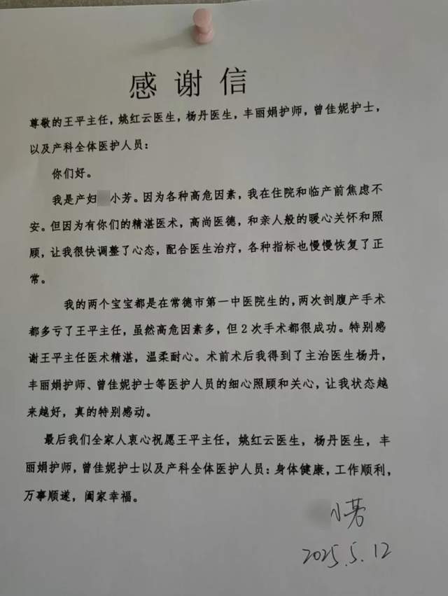 “特别感谢王平主任医术精湛,温柔耐心。”5月12日,一封感谢信悄然出现在产科病房的心愿墙上,写信人是二胎妈妈小芳(化名)。因各种高危因素,小芳在住院期间一直焦虑不安,在产科医护人员的悉心照料下,她逐渐调整心态,积极配合治疗,定于5月13日下午剖宫产。