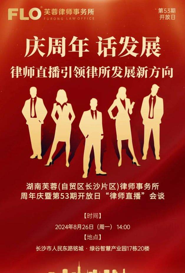 8月26日,湖南芙蓉(自贸区长沙片区)律师事务所将举行一周年庆暨第53期开放日“律师直播”会谈,邀您为分所的发展提出宝贵的意见和建议。同时,也希望您能与我们一同见证这一重要时刻,共同开启新的篇章。