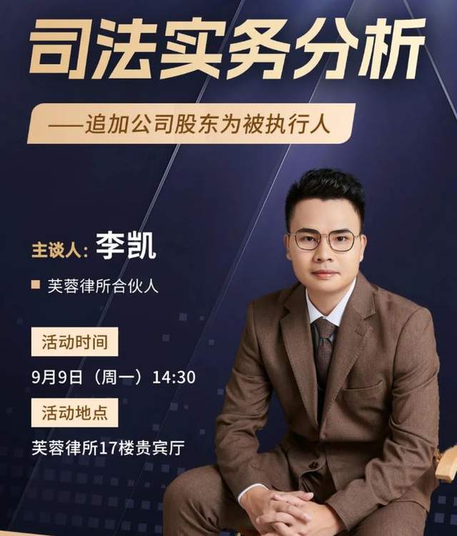 9月9日,湖南芙蓉律师事务所将举办第55期开放日,特邀湖南芙蓉律所合伙人李凯律师分享《司法实务分析——追加公司股东为被执行人》。活动旨在为来访同仁嘉宾搭建交流、合作的开放性平台,创造彼此了解、深入合作的机会。
