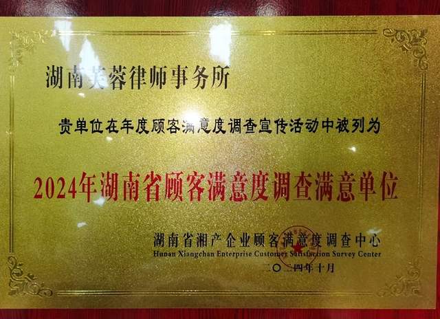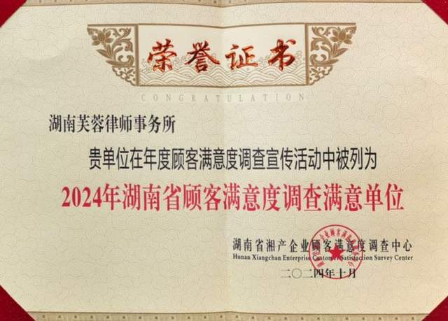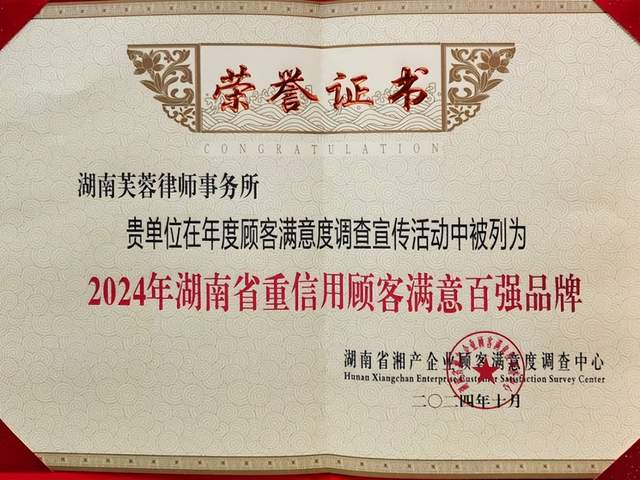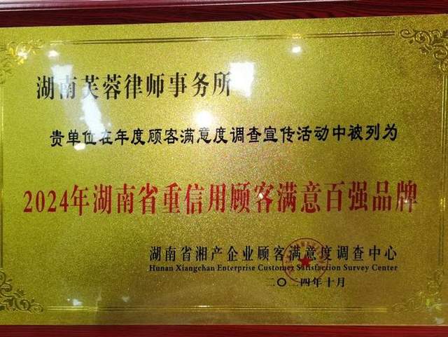 近日,在湖南省湘产企业顾客满意度调查中心开展的企业品牌信誉及顾客满意度调查活动中,湖南芙蓉律师事务所以高质量、高服务的顾客满意度荣膺“2024年湖南省重信用顾客满意百强品牌”与“2024年湖南省顾客满意度调查满意单位”。