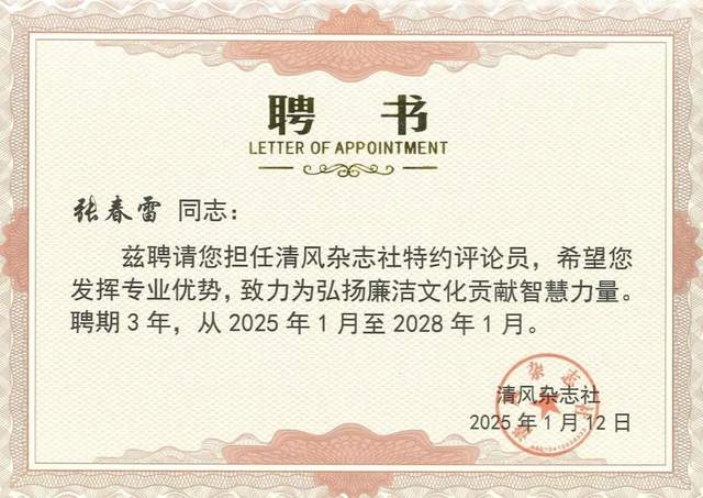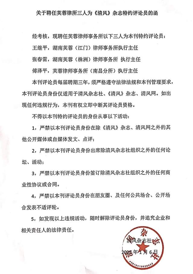 近日,湖南芙蓉(江门)律师事务所执行主任王继平、湖南芙蓉(株洲)律师事务所执行主任张春雷、湖南芙蓉(南昌)律师事务所执行主任傅泽平凭借其卓越的专业素养和深厚的行业影响力,正式受聘为《清风》杂志特约评论员,聘期为三年。这一聘任不仅是对三位分所主任的高度认可,更彰显了芙蓉律所在专业领域不断拓展和深化的影响力。