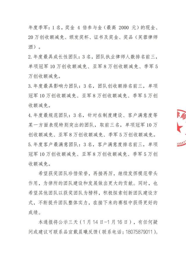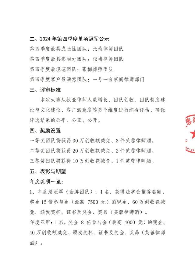 一等奖团队将获得30万创收额减免、3件芙蓉律师酒。