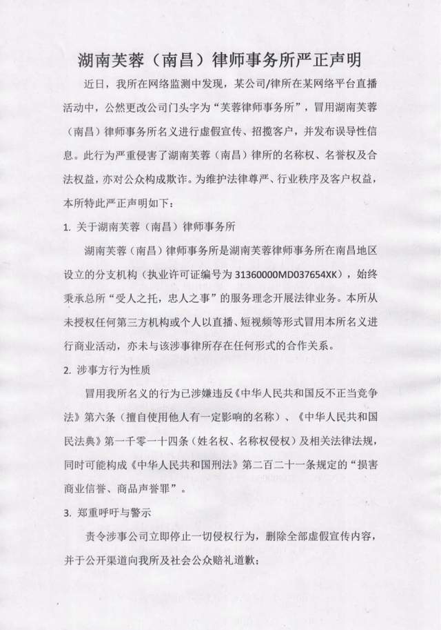 湖南芙蓉(南昌)律师事务所是湖南芙蓉律师事务所在南昌的分支机构(执业许可证编号:31360000MD037654XK),从未授权任何第三方机构或个人以直播、短视频等形式冒用我所名义进行商业活动,与涉事律所无任何合作关系。