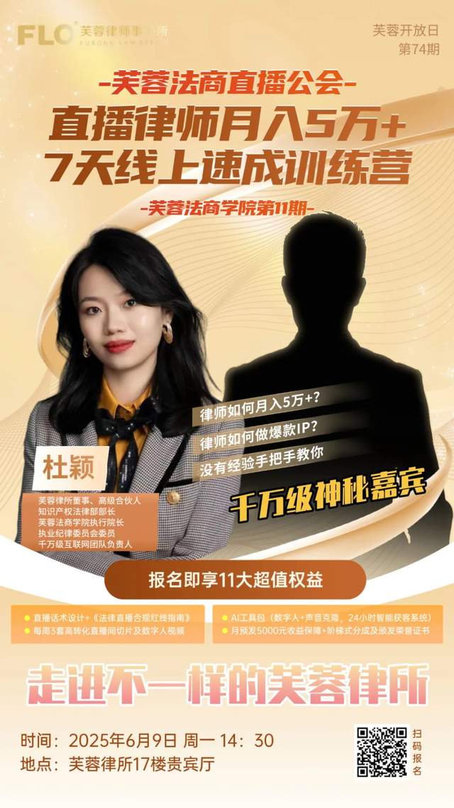 律师如何月入5万+?律师如何做爆款IP?没有经验手把手教你!湖南芙蓉律师事务所第74期开放日即将来袭,本期开放日会由芙蓉律所董事、高级合伙人、知识产权法律部部长、芙蓉法商学院执行院长、执业纪律委员会委员、千万级互联网团队负责人杜颖律师以及千万级互联网神秘嘉宾主讲。