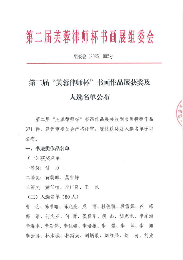 湖南芙蓉律师事务所第二届“芙蓉律师杯”书画作品展共收到书画投稿作品371件,经评审委员会严格评审,现将获奖及入选名单予以公布。