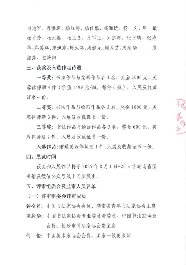 书法作品与绘画作品各1名,奖金2000元、芙蓉律师酒4件(价值1499元/瓶,每件6瓶),入展及收藏证书一份。